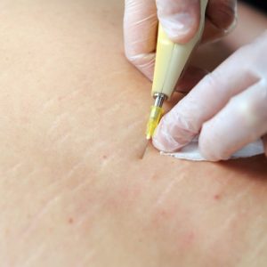 Luego de definir el área a tratar, se seleccionan los principios activos ideales para la paciente y mediante microagujas se realiza la infiltración de los activos en la piel.